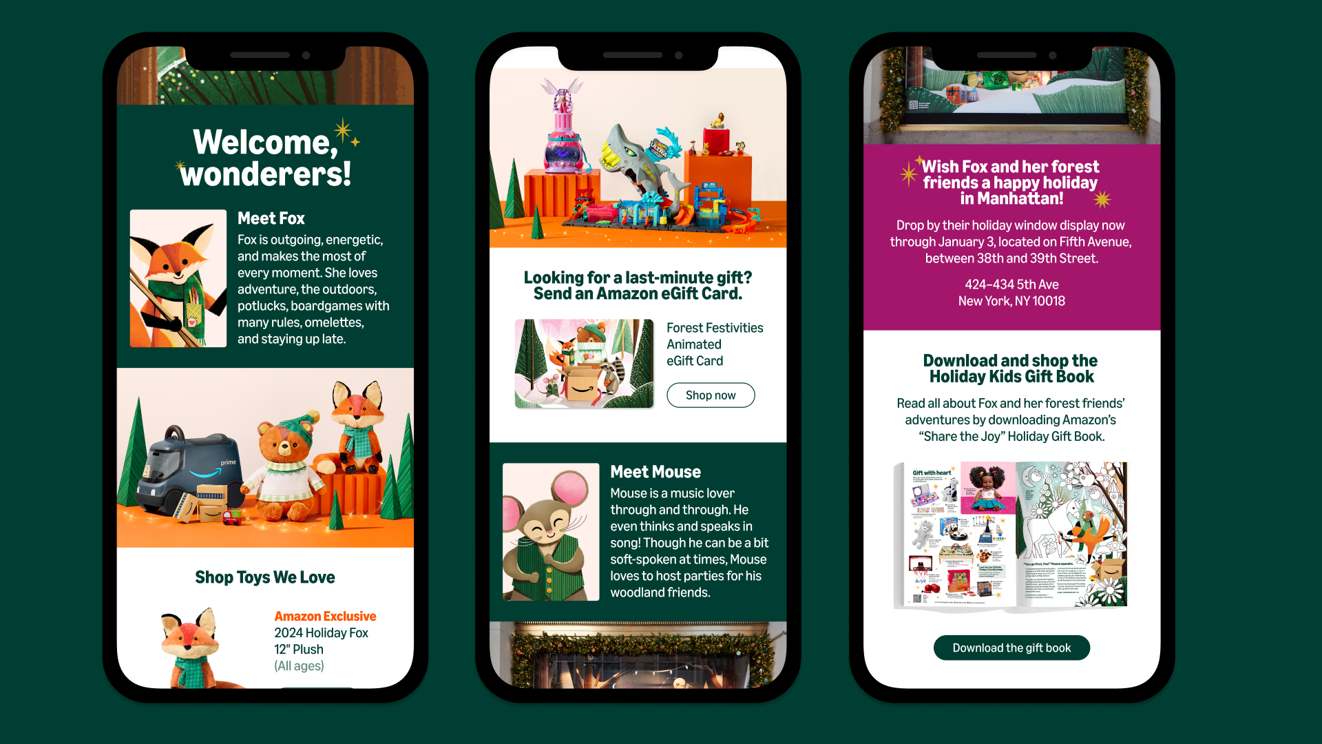 Now in its seventh year, we evolved the Amazon Holiday Kids Gift Book from a seasonal catalogue into a strategic brand initiative aimed at driving both commercial and emotional value across multiple media touchpoints. Starting in 2020, I developed the Fox and Woodland characters in collaboration with illustrator Erin Wallace and created narratives of joy and adventure through bespoke activities that have made the Gift Book iconic and beloved by the customer. From custom Roblox gaming experiences built from the world we imagined, to virtual shopping experiences, to private label products, and Alexa integrations, the characters have inspired a world that lives far beyond the pages of the book and invites to the customer to engage in delightful experiences throughout the season. By combining curated product selection with diverse artistic perspectives, we've created a distinctive Holiday asset that delivers both customer engagement and competitive advantage.