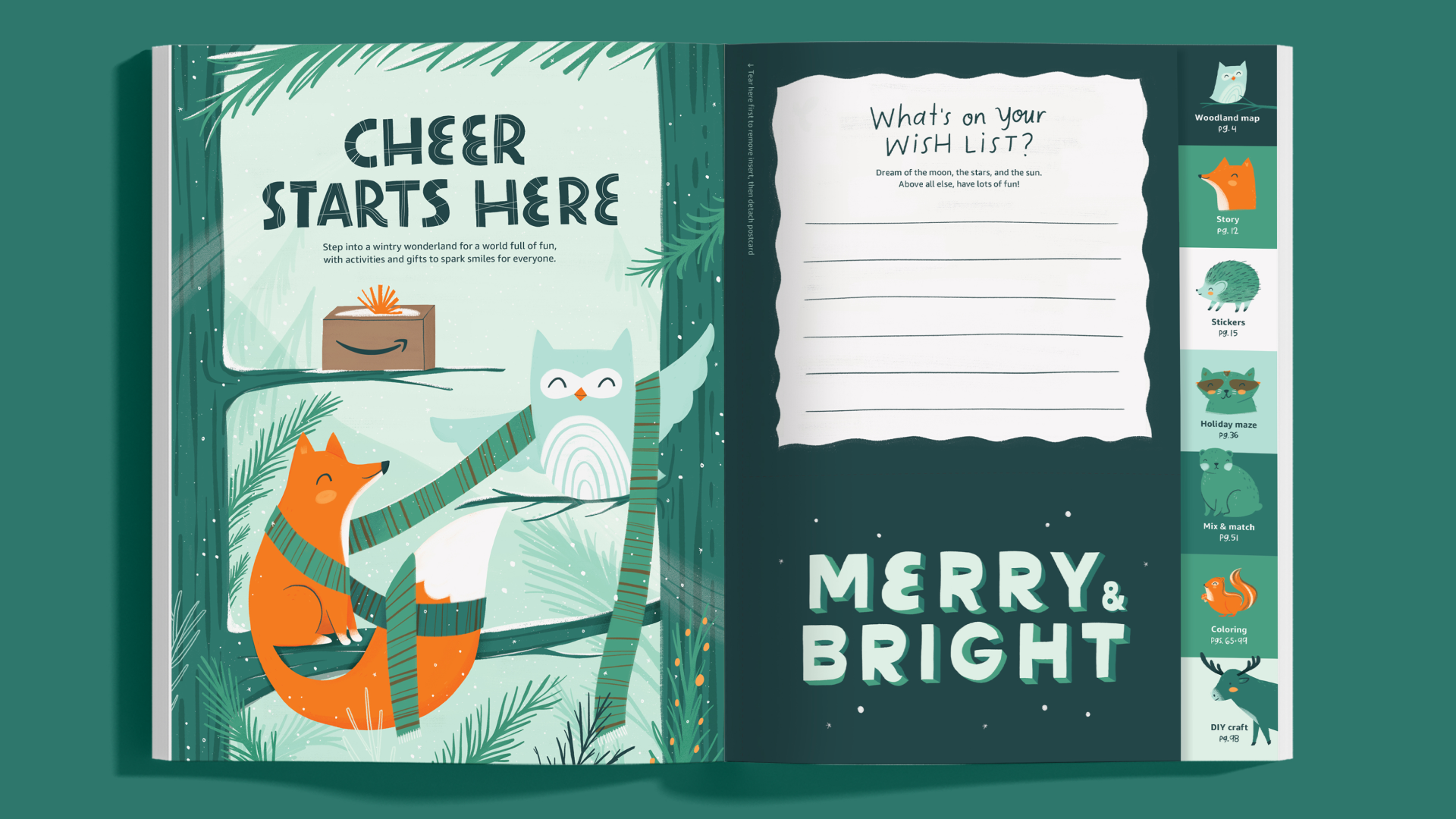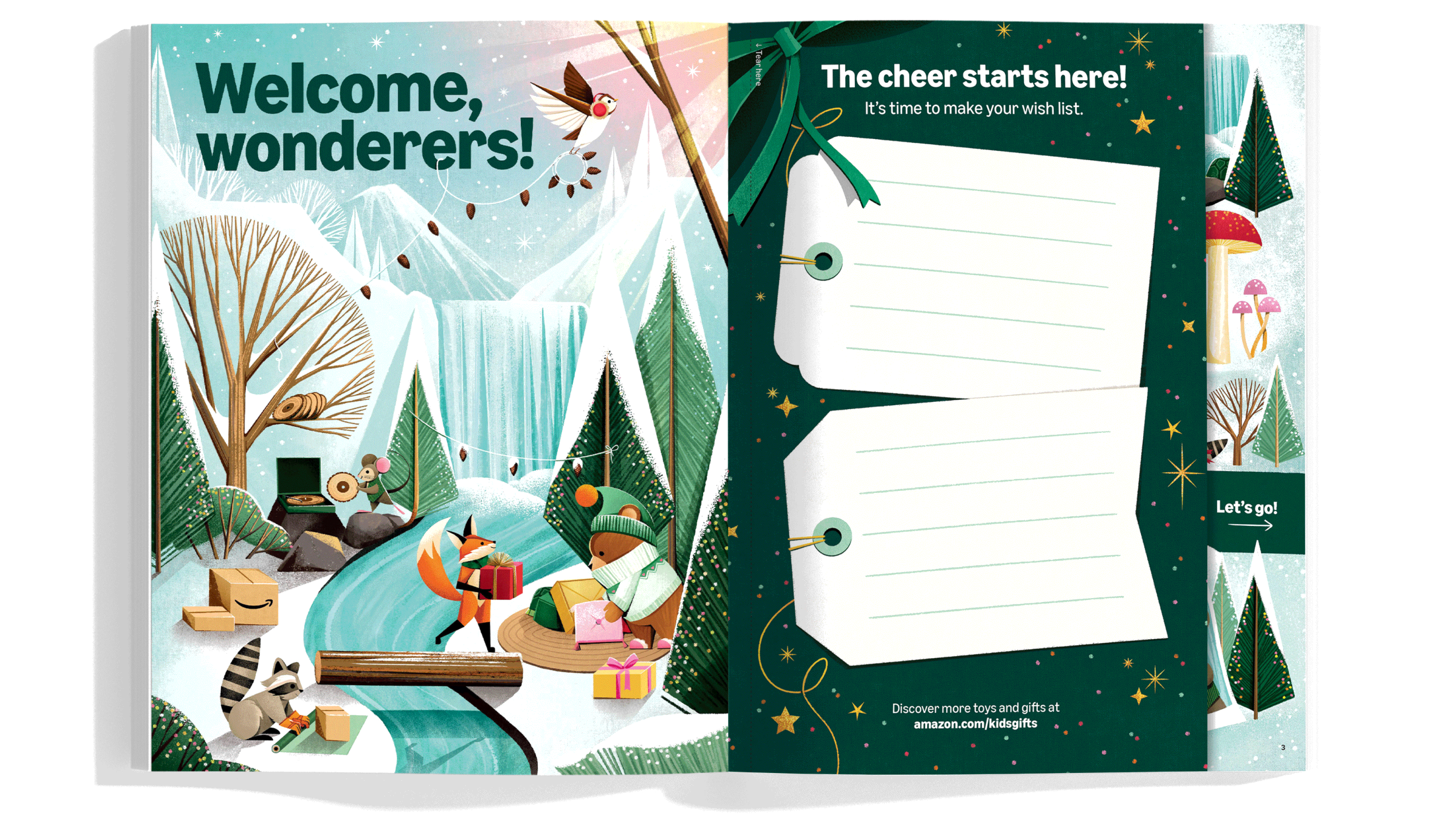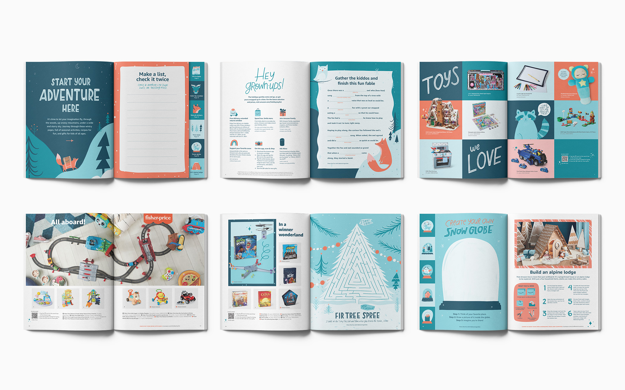 Working with Hybrid Studio and illustrator Laura C. Moyer, we reimagined the 2024 Holiday Kids Gift Book to create a magical experience for customers. Moyer's graphic approach to the woodland characters, paired with Amazon's updated brand design system, brought a new level of delight to this annual tradition. The result: a festive gift guide that captures the wonder of the holiday season while making it easier for customers to discover an astonishing collection of gifts for the kids in their lives.