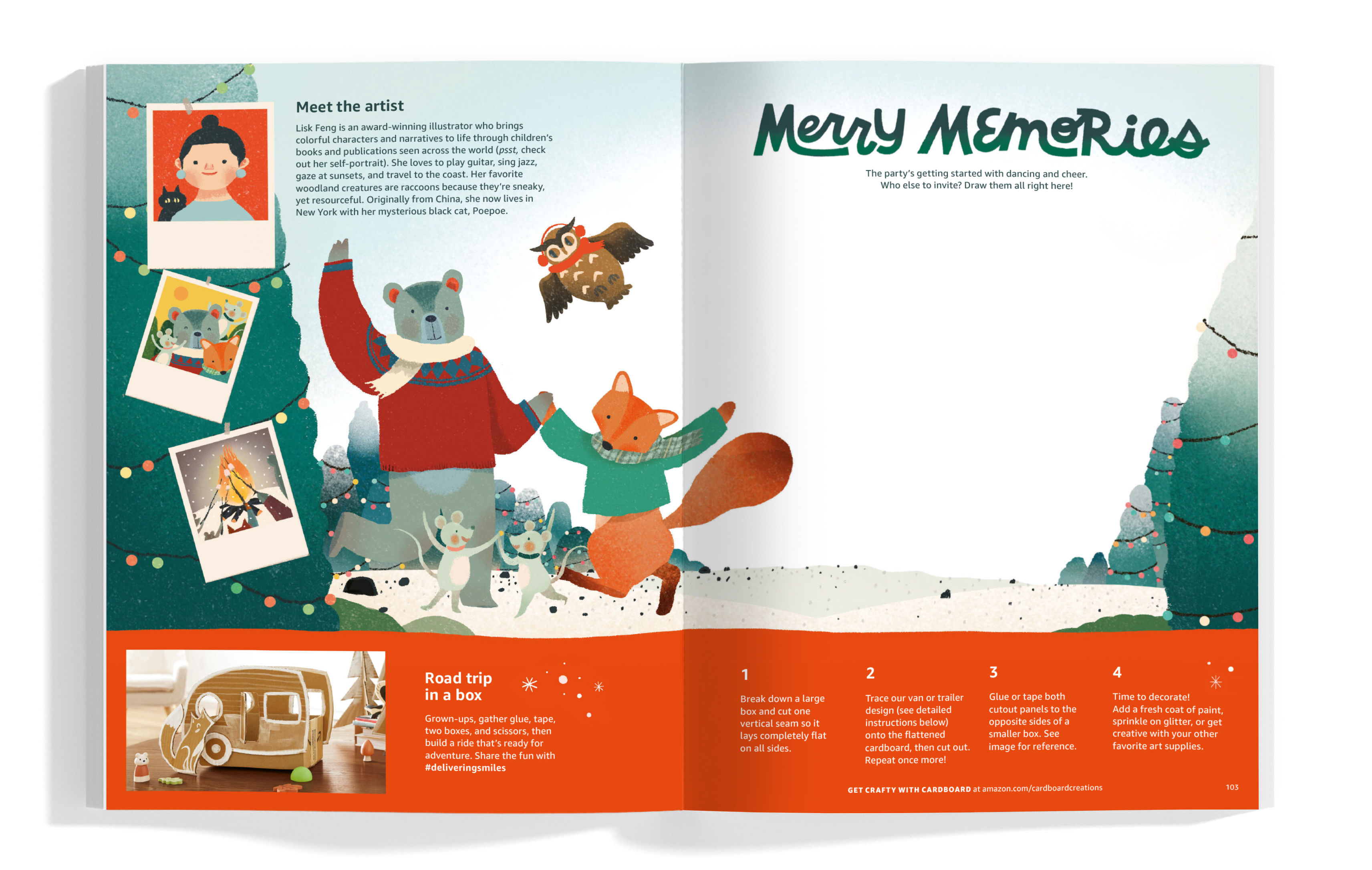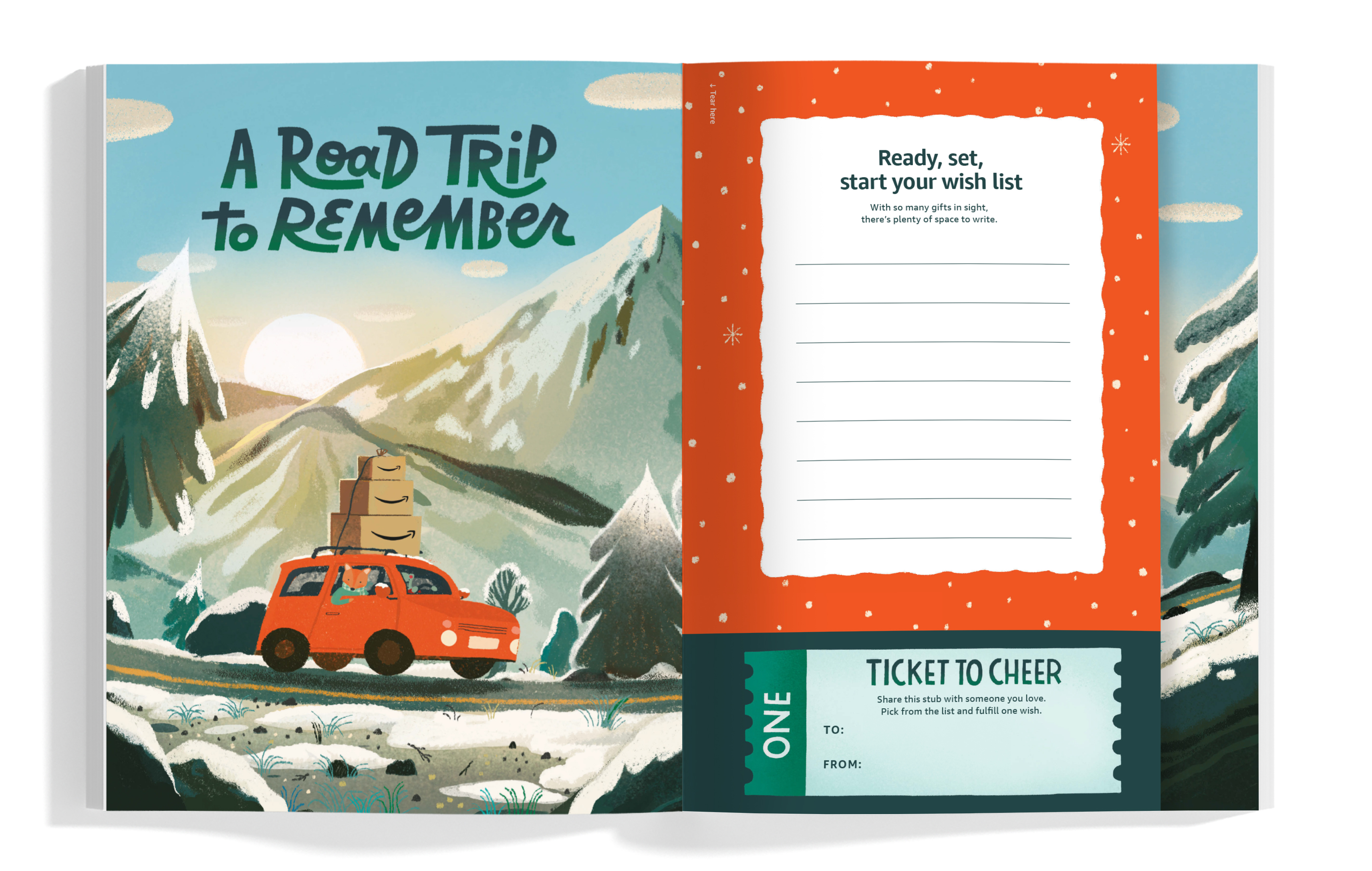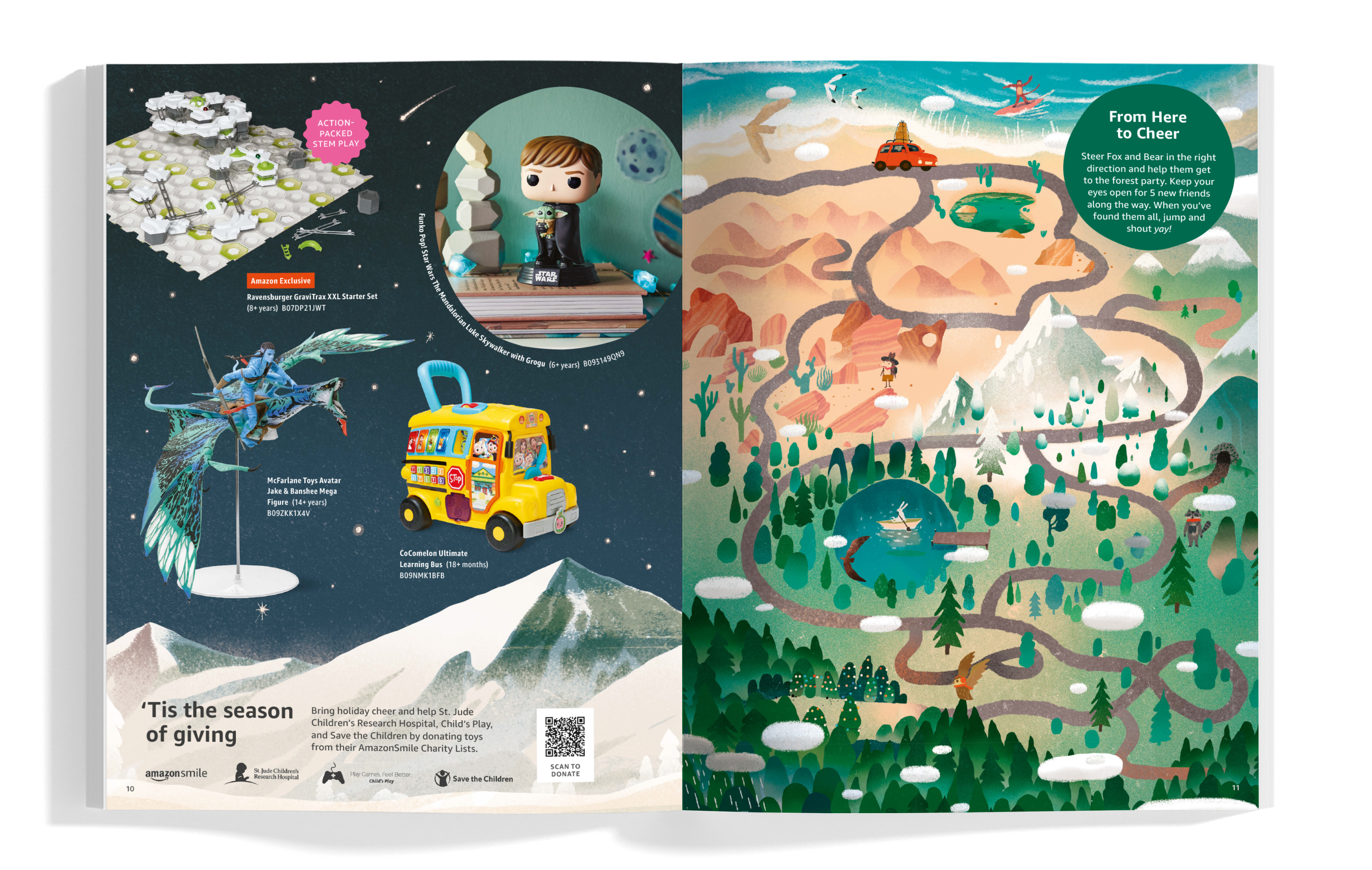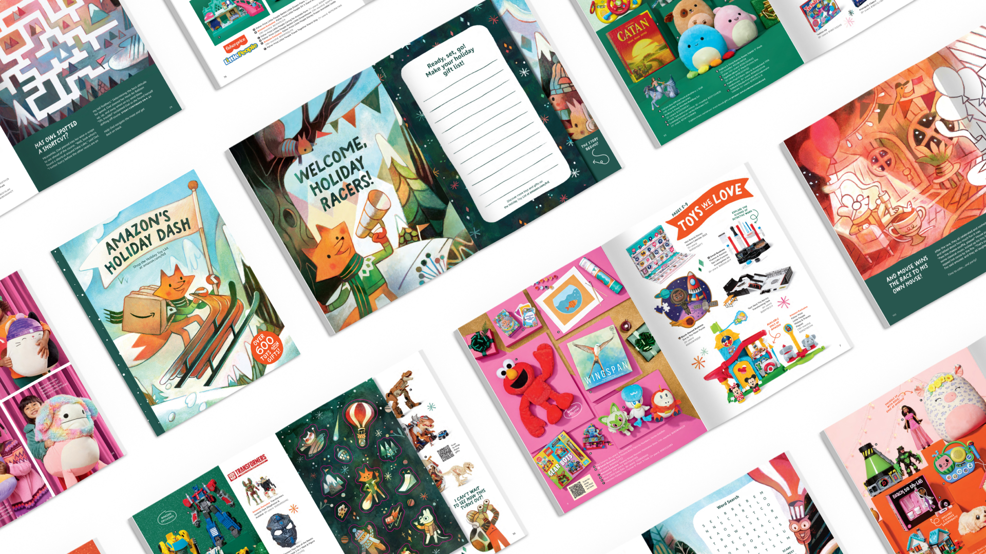 Working with Hybrid Studio and illustrator Laura C. Moyer, we reimagined the 2024 Holiday Kids Gift Book to create a magical experience for customers. Moyer's graphic approach to the woodland characters, paired with Amazon's updated brand design system, brought a new level of delight to this annual tradition. The result: a festive gift guide that captures the wonder of the holiday season while making it easier for customers to discover an astonishing collection of gifts for the kids in their lives.