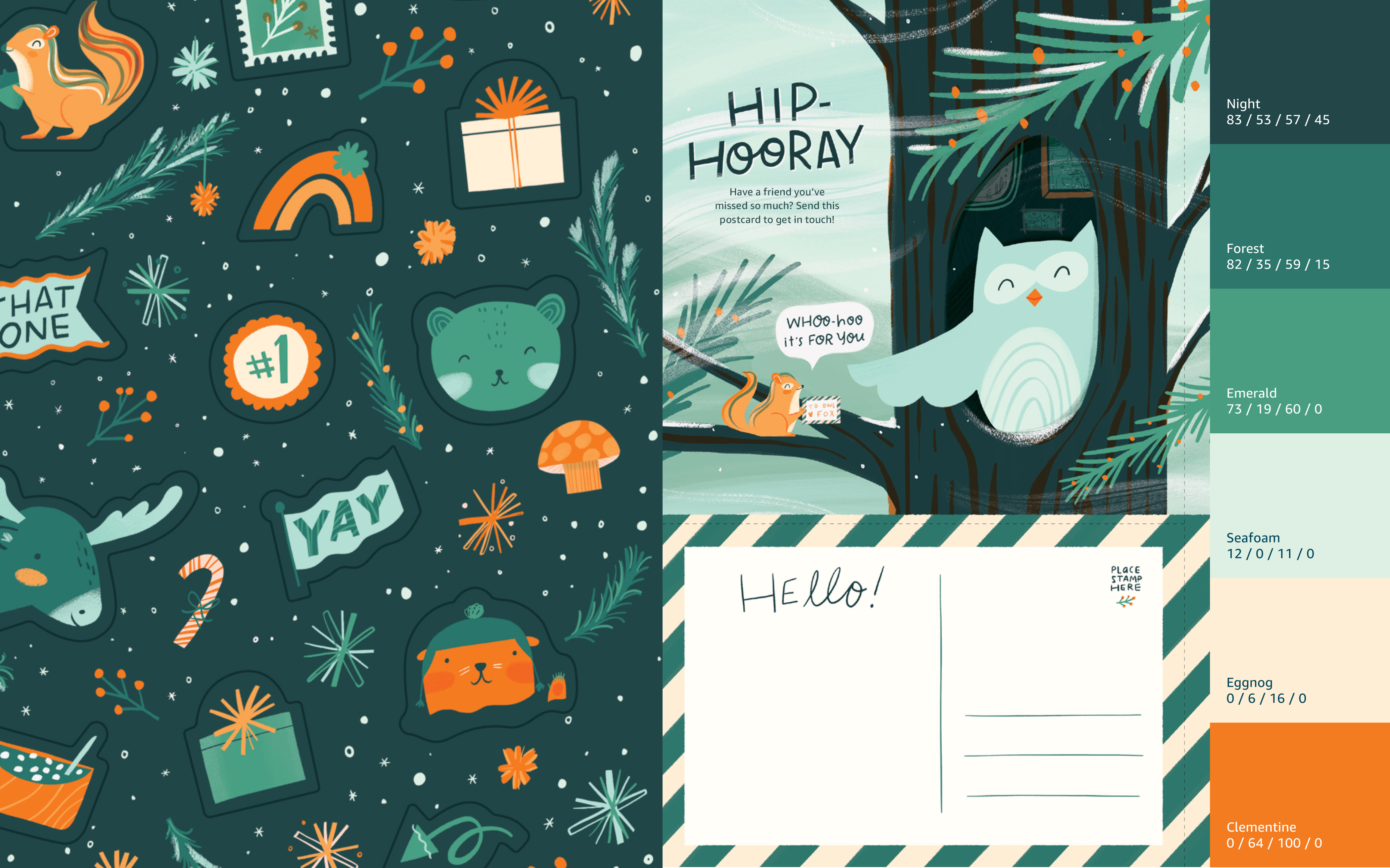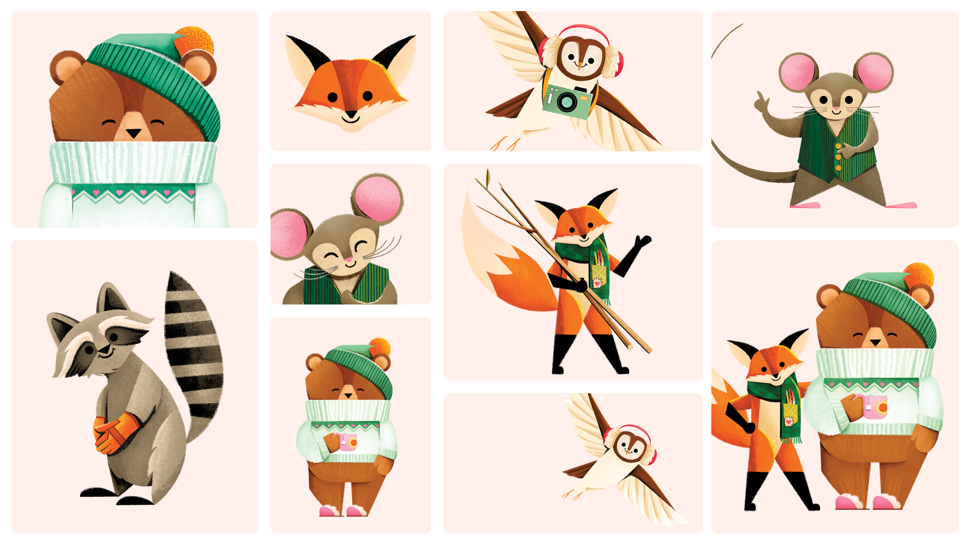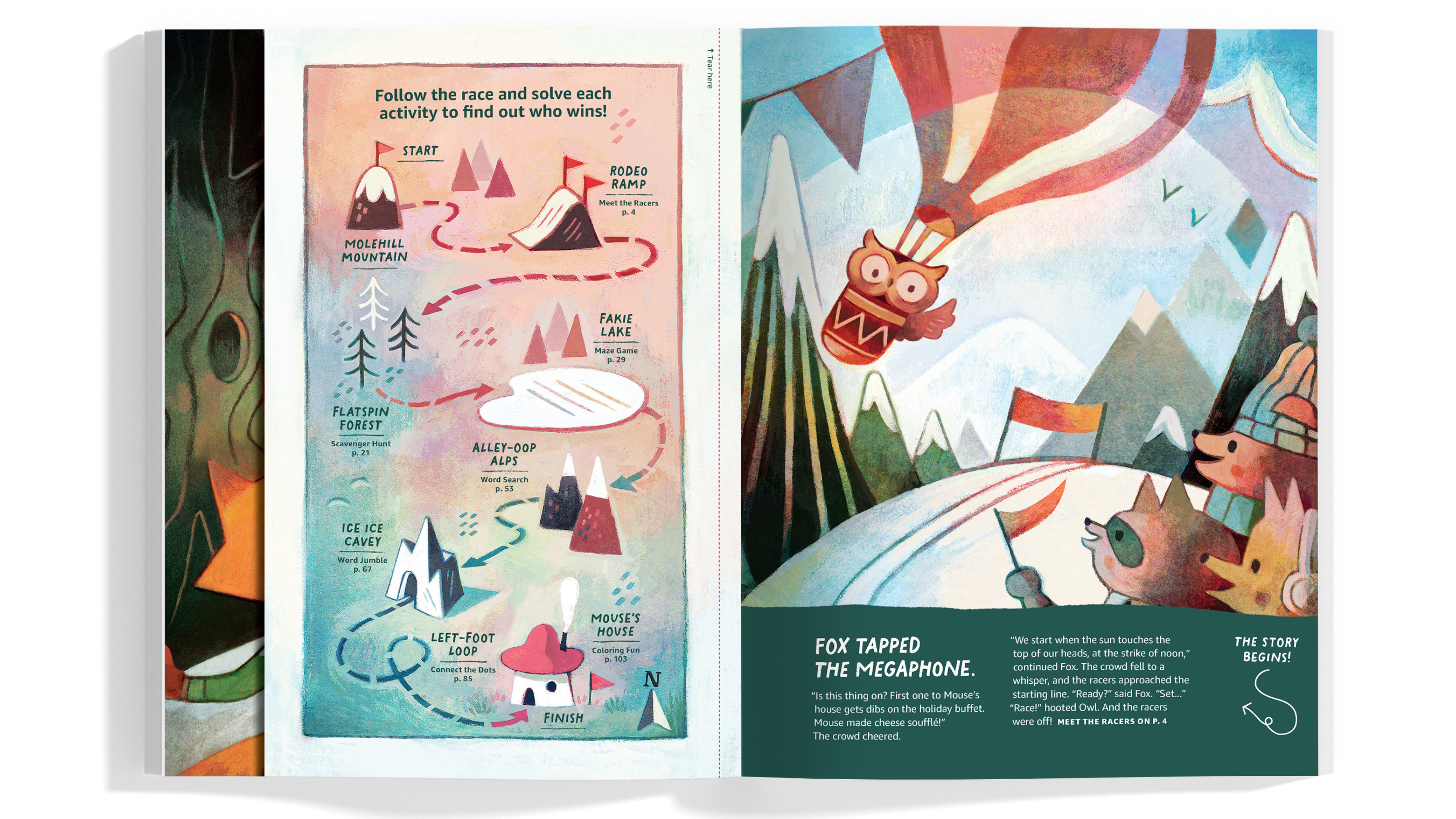 In 2023, we partnered with illustrator Matthew Forsythe to bring a painterly style to the woodland characters with a focus on their discreet personalities and esoteric charm. Designed around the concept of a wintery holiday race through the forest, we crafted scenes of adventure that culminated in Mouse ultimately winning the race. To pair with Matthew’s illustrations, we wrote a story that highlighted the excitement of a race about to begin, including destinations such as Flatspin Forest and Ice Ice Cavey.